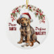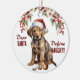 En la parte delantera de este adorable adorno navideño se ve la imagen de un adorable cachorro de chocolate Labrador Retriever vestido con un sombrero de Santa y sentado con un adorno de árbol roto delante de él. El texto rojo dice "Querida SANTA Define NAUGHTY". En la parte posterior, el texto rojo y verde dice "MERRY CHRISTMAS", y hay campos de texto adicionales para que usted tenga personalizar a lo que le gustaría. Asegúrese de ver otras imágenes de Lab, así como productos, en Dog Village.