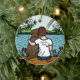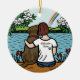 Ornamento conmemorativo de Chocolate Labrador Angel y Mom Brown. Una mamá labradora está sentada sola en el lago y mirando hacia el arcoiris con la esperanza de conocer a su Labrador de Chocolate perdido algún día... Pero no es la única. Su leal perro está sentado a su lado, muy cerca. Solo que es invisible. Puede personalizar de texto para usted. El tierno y lindo Labrador Retriever Art creado por Naomi Ochiai de Japón.