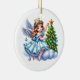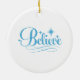 This ceramic ornament is shown with a cute holiday angel art print with a believe print on the back side.