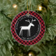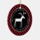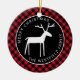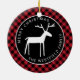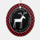 En este adorno rústico de árbol navideño de búfalo rojo a cuadros, un ciervo blanco de arte popular está centrado en un círculo negro, con su nombre y "Feliz Navidad" curvados alrededor de la ilustración en tipografía sans serif blanca. Puede revisar fácilmente el texto de ejemplo con sus propios detalles.
