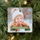 Muestra tu foto especial con este adorno de cerámica cuadrada festiva con etiqueta de cinta verde con texto de Feliz Navidad con acento hueco. Reemplace con su foto especial para un regalo perfecto para las vacaciones.