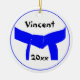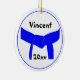 Personalizar el único ornamento redondo de la correa azul de las artes marciales con el nombre de tu artista marcial y el año actual o el texto de tu elección para conmemorar un examen o prueba de promoción de rango de cinturón en karate, taekwondo, kung fu, judo o ju jitsu. Este de un adorno deportivo de artes marciales personalizados presenta una fotografía digitalmente realzada de una fosa azul ligera atada a un nudo.