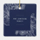 Un moderno y elegante adorno vacacional que enmarca tu foto cuadrada favorita en un marco muy bien detallado con ramos de pino, hojas de invierno, anís estrellado y rodajas de cítricos sobre un rico fondo azul marino. Personalice la parte posterior de este único ornamento de fotos de Navidades con su nombre de familia.