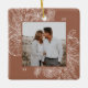 Un moderno y elegante adorno vacacional que enmarca tu foto cuadrada favorita en un marco muy detallado con ramos de pino, hojas de invierno, anís estrellado y rodajas de cítricos en un rico fondo de tierra. Personalice la parte posterior de este único ornamento de fotos de Navidades con su nombre de familia.