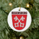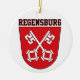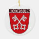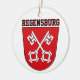 This ceramic ornament features the official Coat of Arms of Regensburg, a historic city in Bavaria, Germany, situated at the confluence of the Danube, Naab, and Regen rivers. Regensburg is one of Germany's oldest towns and a designated UNESCO World Heritage site.