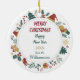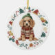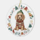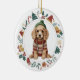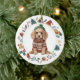Este adorable ornamento Holiday presenta una acuarela de un adorable cachorro de Cocker Spaniel vestido con su suéter y gorra de invierno. La imagen está enmarcada en un círculo colorido formado por varias imágenes del día festivo, incluyendo un muñeco de nieve, campanas, caramelos, medias, ¡caramelos y más! La parte posterior del adorno tiene la misma imagen de corona con el texto de su personalizado en verde, oro y rojo.