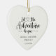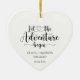 Un adorno de anuncio de compromiso con la frase popular: "que comience la aventura". Un adorno versátil. Un regalo conmemorativo para la pareja, O regalo de propuesta para el séquito de boda. Presenta este regalo a amigos mientras les pides que sean parte del séquito de boda. ¡Pero no te olvides de mamá y papá! Sorpréndelos con este recuerdo también!