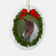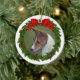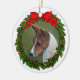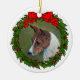 Dibujo de perro Basenji rojo y blanco con una corona en un adorno de Navidad de cerámica redondo.