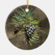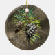 Ornamento de pintura de acuarela de cono de pino para tu árbol de navidad, saludando a tu amigo con Felices vacaciones.