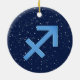 Ornamento en el símbolo zodiaco para Sagittarius en azul plateado suave, cubierto con las estrellas de la constelación, contra un fondo cielo estrellado de azul oscuro