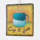 Este vibrante diseño de café muestra una taza verde azulada de dos tonos contra un sorprendente fondo dorado y naranja, acentuado por un audaz borde de diamante negro y rojo. ... Arte Qzik