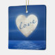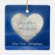Este ornamento de nuestro primer árbol de Navidad para parejas presenta una luna de corazón sobre un cuerpo de agua. El frente tiene el texto "amor" en la luna del corazón. Este ornamento puede ser personalizado con nombres, un año o cualquier texto que desee añadir.