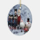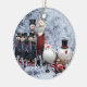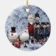 Este colorido ornamento arbóreo presenta a todos los personajes favoritos de los Navidades tradicionales, Santa Claus, un soldado a la antigua, un muñeco de nieve, pingüino, todo hecho de lata contra una escena nevada.