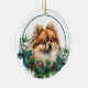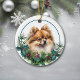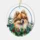 En la parte delantera de este adorno navideño hay un hermoso retrato de un adorable perro Pomerania rojo asomándose de una rama de acebo y perenne. Las bayas rojas y las piñas decoran las ramitas de acebo y pino. La imagen está colocada en un círculo blanco dentro de un marco de borde circular delgado azul verdoso. La parte posterior del adorno tiene la misma corona de ramas perennes y círculo con su texto personalizado en rojo. ¡Precioso!