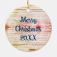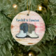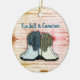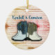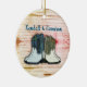 En casa de campo, los Navidades conservan el adorno con dos botas de vaquero. Diseño artístico para la pareja, o familia en un nuevo hogar, o para conmemorar un hogar establecido. Personalice el texto en ambos lados con un tipo de letra en negro, impreso, sobre tableros de madera gris.