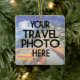 Crea tu propia foto de dos fotos de vacaciones de verano adornando tu nombre de ubicación y fecha! Si has viajado este año y quieres recordar un lugar especial, este año, te gustará recordar el viaje con este único y personalizado adorno de Navidades con dos de tus propias fotos de viaje, así como tu ubicación de viaje y el año de tu viaje en la moderna tipografía de escritura con letras a mano. Fácil de personalizar con su ubicación de viaje, fecha de viaje y dos de sus propias fotos. Fotografía de palmeras hawaianas y cenador tomada en la Isla Grande de Hawaii, © de TK Goforth. ¡Puedes guardar esta foto en el adorno, si lo deseas, para conmemorar tu viaje a Hawái!