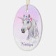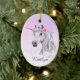 Un bello unicornio blanco está decorado con flores rosas y azules, y surge de las nubes blancas onduladas en este adorno de bonito para ella. La imagen de unicornio se coloca sobre un fondo de lavanda rosa degradado con estrellas distantes dispersas. En la parte inferior está su nombre en lavanda más oscura. La parte posterior del adorno tiene la misma imagen y fondo, con un segundo campo de texto para que usted lo personalizar, o salga como está. Agradable para Navidades, pero también apropiado para su cumpleaños o cualquier otra ocasión especial.