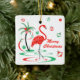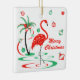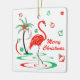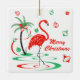 Una diversión, un diseño festivo, del flamenco con un tacto retro en rojo y un verde. Los flamencos rojos vadean en el agua al lado de las palmeras adornadas con las chucherías y la cinta del navidad. Un diseño adaptable para que usted personalice con su propio texto, imágenes e ideas. Una imagen digital original del arte creada por Jess Perry.