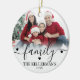 Family Christmas Photo Ornament. Celebrate the joy of the season with this elegant, custom ornament featuring your favorite photos. The front displays the word “family” in flowing script across the top, with your family name below in a timeless serif font for a personal touch. The back includes space for a second photo, perfect for another favorite memory or festive moment. Soft white ombre details and customizable font and accent colors make this keepsake ornament a warm, classic addition to your holiday decor.