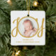 This cute Baby's First Christmas Photo Ornament is decorated with the word JOY in stylish gold script typography on a white background.
