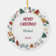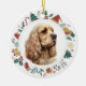 Aquí hay un adorable adorno personalizado para cualquiera que ame a un perro Cocker Spaniel. La parte delantera tiene una hermosa acuarela de un Cocker Spaniel americano de color abrupto. El retrato del perro está enmarcado en un círculo colorido formado por varias imágenes de las fiestas, incluyendo un muñeco de nieve, campanas, bastón de caramelo, caldo de leña, caldo de leña, ¡y más! La parte trasera del adorno tiene la misma imagen de corona con un Navidad y el saludo de Año Nuevo. Asegúrese de actualizar el campo de texto del personalizado para el nombre y el año adecuados. Y ver más imágenes y productos de perros esnaniel en Dog Village.
