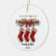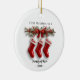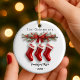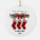 Celebrate your family’s first Christmas together with this adorable Family of 3 Stockings personalized ceramic ornament. Featuring three cute red stockings hanging from a rustic wooden branch adorned with greenery, berries, and little red bows, this design captures the warmth and joy of the holiday season. Each stocking represents a special family member and can be personalized with names to make it truly unique. Crafted with care and printed on high-quality ceramic, this ornament makes a heartfelt keepsake or a thoughtful gift for new families celebrating their first Christmas together.