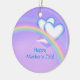 Bonito adornado con mi obra de arte de dos corazones blancos y azules sobre un arco iris en un cielo morado. El texto del personalizable dice "Feliz Día de la Madre".