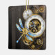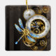 Diales antiguos con artes de oro y latón, decorados con libélula mecánica sobre fondo marrón, rayado. Steampunk.