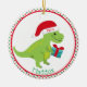 Un dinosaurio verde lindo lleva puesto un sombrero de Papá Noel rojo y un regalo azul. El borde son puntos rojos y verdes de polka. Personaliza con el nombre de tus hijos al final y el año en su gorra. El lado inverso es el mismo diseño.
