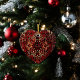 Patrón oriental de alfombra en rojo oscuro y crema - una imagen antigua IMPRESIONADA en este adorno cerámico en forma de corazón - un diseño atemporal con detalles intrincados de un libro antiguo - alterado y puesto en numerosos productos de Alma Wad . Excelente opción para cualquiera que desee añadir algo de color y calidez a su árbol de Navidad .