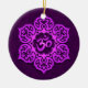Un Aum u OM diseña se sienta dentro de una flor de loto estilizada. El modelo circular se colorea con un de color violeta oscuro que se destaque para crear un brillo ligero en la superficie. El fondo es la púrpura oscura pintada que se puede considerar a través del espacio negativo de la flor. Una sombra aparece apenas debajo del diseño que lo hace parece flotar apenas sobre la superficie del ornamento. Este diseño elegante es una representación llamativa de este símbolo espiritual.