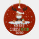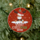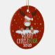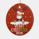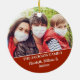 Celebrar y conmemorar a estos Navidades de 2020 con este divertido árbol de Navidad adornado con un adorable reno personalizado con un gorra rojo, máscara facial y un desinfectante a mano, decorado con copos de nieve. La leyenda del juego de palabras dice Merry Christmask 2020 en blanco y verde todas las letras de mayúsculas y minúsculas. La parte posterior es el personalizable con la imagen de su familia y sus nombres o texto personalizado.