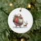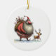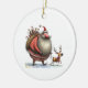 Divertido Papá Noel con un lindo reno y su bolsa de regalos en un adorno navideño de cerámica. El texto de la parte posterior puede cambiarse. Ilustracion acuarela con gráfico asistido por IA adquirido con uso comercial. Pintura: RedHeronLighthouse