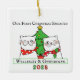 Dos gatos de la primera Navidad enganchados Dos gatos blancos se guiñan el uno al otro con un punteado de polka rojo y blanco con un árbol de Navidad detrás de ellos. Nuestra Primera Navidad Comprometida está por encima de los gatos, con nombres personalizados bajo ellos y el año, que es un contorno con números rojos y verdes colocados fuera del contorno. ¡Qué lindo! En la parte de atrás hay un árbol de Navidad con el corazón en la parte superior y una pequeña caja de texto para dejar una nota dulce. Este diseño es ideal para los amantes de los gatos y los propietarios de gatos que pasan juntos su primera Navidad como pareja comprometida.
