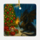 Cool Black Dragon on Christmas Day by a tree and gifts, Holiday Ceramic Ornament.