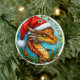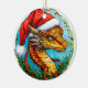 Ilustracion vibrante y colorido de un dragón vestido con un sombrero de Santa Claus rojo, adornado con piel blanca. El dragón tiene escalas doradas y una expresión intensa, rodeado de ramas de pino verde y un fondo azul, lo que le da un aspecto festivo y caprichoso.