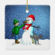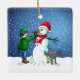 El niño ha construido un muñeco de nieve en el que su perro se para y orina mientras el niño le da al hombre de nieve una nariz de zanahoria.