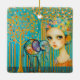 Un elefante estilizado y colorido se alza junto a un chica con ojos grandes y un gorra caprichoso y con estampado. Árboles brillantes y punteados y vibrantes rayas verticales llenan el fondo con una sensación de fantasía y asombro. Photoshop CS5 de arte digital