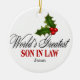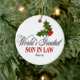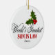 Ornamento navideño para tu hijo favorito en la ley que tiene la baya roja y las palabras El mejor hijo en la ley del mundo.