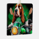 Un amigo peludo detrás de las manillares de una brillante bicicleta verde, usando un traje verde del Día del San Patricio que hace que las cabezas se vuelvan. El perro está vestido con un conjunto festivo, con una corbata verde de arco y un sombrero superior a juego que se sienta cómodos sobre su cabeza. El conjunto presenta un diseño intrincado de rocas de champú y leprechauns, lo que deja claro que este perro está listo para celebrar el Día de San Patricio con estilo.