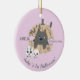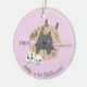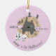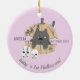 Primer ornamento de cerámica de calabaza de gato rosado de Halloween para bebé. Dibujo simple de un gato en una calabaza con dos calaveras espeluznantes. Añade tu nombre, año y texto.