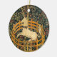 Ornamento con el tapiz medieval La Unicornio en cautiverio (1495-1505). El sétimo tapiz de Los Tapestries Unicornio —también conocido como El unicornio descansa en un jardín— muestra un unicornio blanco con un collar azul dentro de una cerca. El unicornio está rodeado de hierba verde y hermosas flores. ¡Un regalo fantástico para los coleccionistas de arte medieval y para los amantes de la fantasía!
