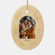 Your family holiday photo will appear in a stylish arch shape on this elegant Christmas ornament. The beige leather print will provide a nice light neutral background, and the leather look is a luxurious touch. Festive golden branches with leaves encircle the arch photo template. There's a template for your family name and the year to personalize this ornament. The script typography complements the graceful and delicate lines of the botanicals.