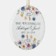 Pretty wildflowers decorate the bottom of this colorful spring wedding keepsake Christmas ornament. Watercolor floral borders are perfect for a garden ceremony outdoors while flowers are in bloom. Elegant script dances above a beautiful orange, purple, yellow, and blue botanical meadow on this custom favor or newlywed gift.