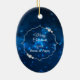 Este elegante adorno cuenta con una silueta plateada de patinaje sobre hielo en un fondo azul bonito con pequeñas estrellas. Su nombre es plateado en una pancarta semitransparente enmarcada en un falso purpurina blanco. La parte posterior del adorno tiene el mismo fondo azul con tres campos de texto personalizados en el centro de un lujoso cartel enmarcado con diamante falso.