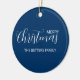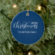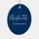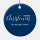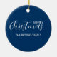 Elegante, simple, limpia, ornamento de Navidad de cerámica azul medianoche con texto personalizado escrito a mano en blanco.