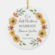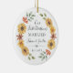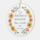 Elegante adorno navideño con una corona de ilustracion de girasoles. Personalizado con el texto "Nuestra primera Navidad se casó", los nombres de la pareja y el año establecido. Diseño de doble cara.