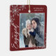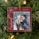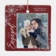 Este adorno navideño cuadrado rojo es un regalo perfecto para la pareja recién involucrada. El diseño presenta un marco fotográfico con texto escrito a mano "Engaged" y se acentúa con copos de nieve grises claros sobre un fondo rojo. Personaliza con una foto de la pareja, sus nombres y año.
