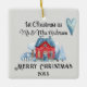 Ilustracion acuarela de una casa de invierno de color rojo y azul brillante con "primeros Navidades como" nombre del Sr. y la Sra. newlyweds y Feliz saludo de Navidad con año. Este adorno vacacional de cerámica cuadrada tiene un fondo de color de corazón azul y platino a juego. Cambie fácilmente el texto para que sea suyo utilizando la plantilla proporcionada. También se puede disfrutar de un estilo metalizado o de cristal. Consulte "Acerca de este producto" para obtener más información sobre el tamaño y los materiales.