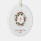 Un elegante adorno inicial de navidades con un monograma de vegetación. Este adorno de árboles de navidad presenta una corona de eucalipto con bayas rojas y una inicial en medio de la corona. Se puede personalizar todo el texto de la tarjeta. Hay una foto en la parte posterior del adorno. La foto es sólo con fines de colocación y puede ser reemplazada por cualquier foto.